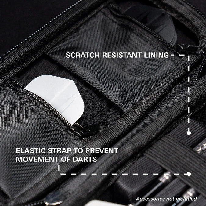 Constructed with a durable hard shell, the Takoma keeps your darts safe and protected. The scratch-resistant interior lining secures 3 fully assembled darts, while zip pockets provide space for additional accessories such as spare flights, shafts, Swiss Points, or your Swiss Point tool combining style and practicality in one premium case.