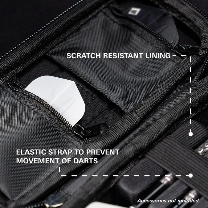 Constructed with a durable hard shell, the Takoma keeps your darts safe and protected. The scratch-resistant interior lining secures 3 fully assembled darts, while zip pockets provide space for additional accessories such as spare flights, shafts, Swiss Points, or your Swiss Point tool combining style and practicality in one premium case.