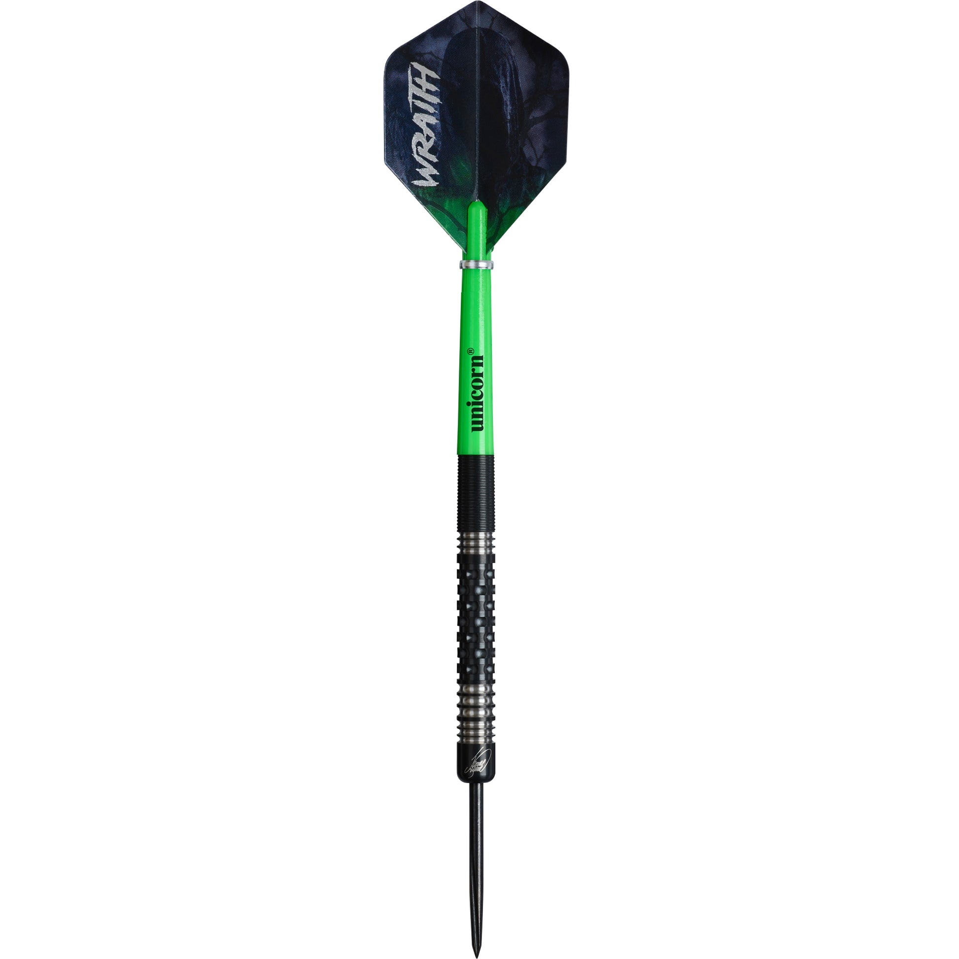 Building on the success of the game-changing Wraith® grip, the Unicorn James Wade Wraith® Dart combines innovative engineering with The Machine’s trademark precision. Crafted for advanced players, the barrel’s parallel 90% tungsten construction offers a slim profile for tighter groupings, while the Wraith® series’ hallmark complex milled grip design, placed centrally, delivers maximum control for consistent performance. Finished with a sleek stealth-black PVD coating and fitted with a patented 36mm Volute® point to reduce bounce-outs and extend dartboard life, the James Wade Wraith dart ensures elite performance with every throw.
