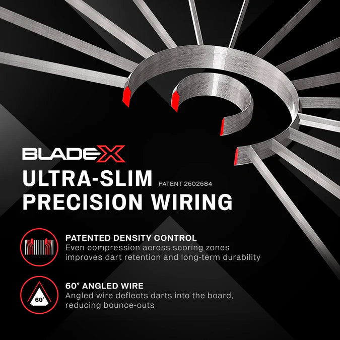 An ultra-slim wiring system increases the surface area of the scoring zones, with a 60-degree angled wire design that guides darts into key scoring areas, dramatically reducing bounce-outs and deflection.